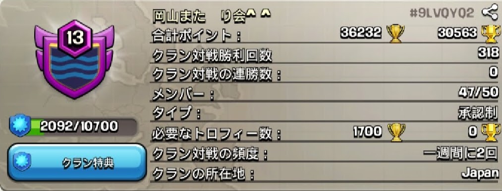 2018.5.13現在,クランレベル13です。