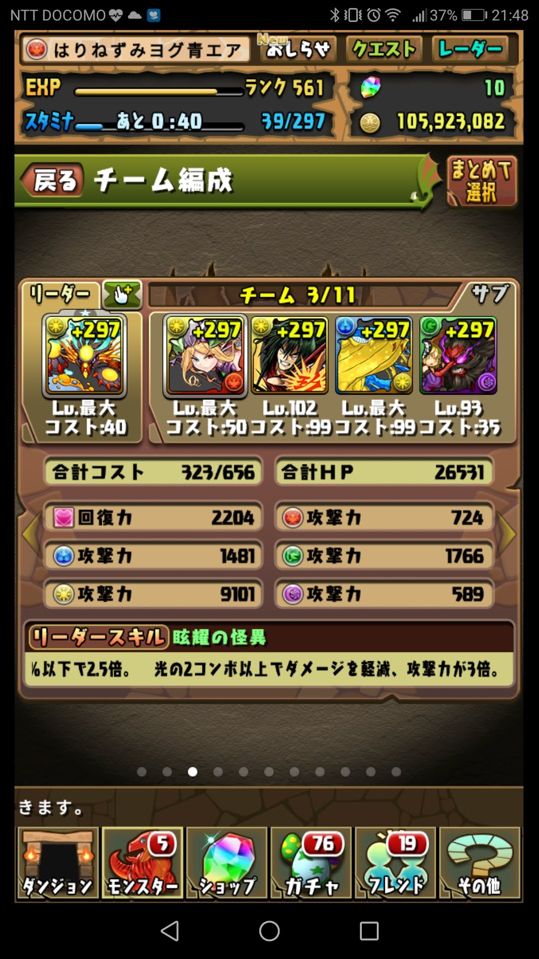 パーティーはリーダーヨグ、ヘラドラの吸収対策に分岐比古清十郎、分岐比古の超覚醒は雲対策にしているため、2階の根性対策に白ソニア、吸収無効スキルを貯めるためにウェルドールと天狗の究極、フレンドにヨグです。オール+297でスキル開放済みです。ウェルドール2体でなくあえて究極天狗を入れているのは1階でスキル遅延を受けずに、闇バインドの生贄にするためです。(笑)このスキブ数で3階でちょうど比古清十郎の吸収無効が貯まります。潜在覚醒は何でも良いです。スキル遅延をみんな持ってればウェルドール2体でも良いかも。